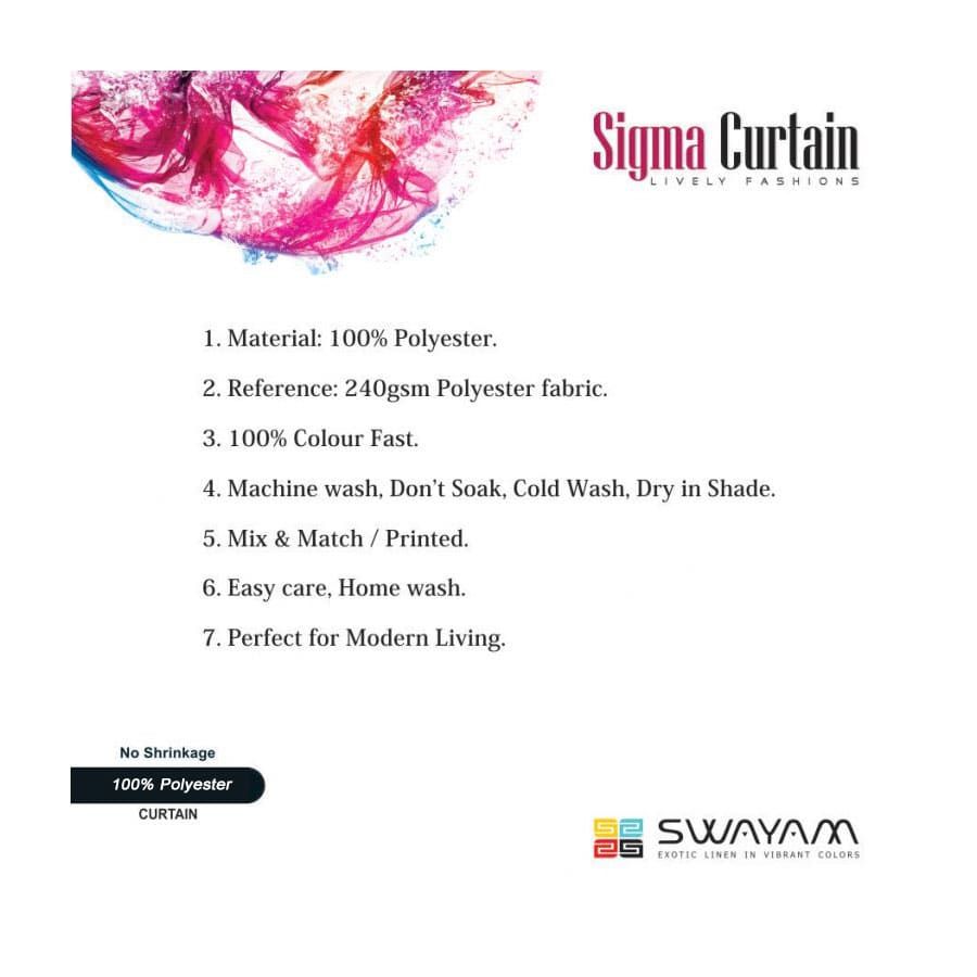 | Sigma Window Curtain 1U (ITEM CODE: SIG01) Total Item: 1U | 137 cm x 150 cm / 1.37 m x 1.50 m / 54 x 60 | ₹ 1,549/- |