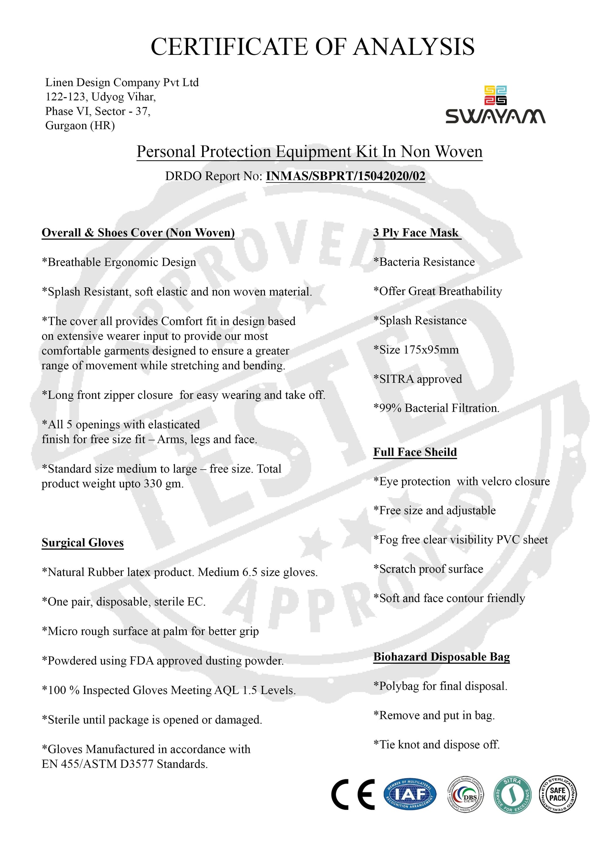 - Sterilized after manufacturing hence 100% virus / bacteria free. Coverall Sitra Approved