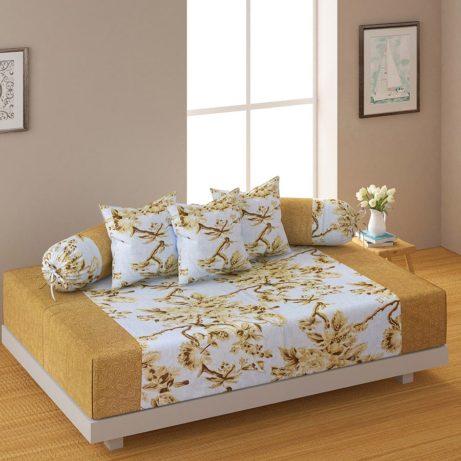 Diwan set: Sheet 1U + Bolster Cover 2U + Cushion Cover 5U (ITEM CODE: DWN18) Total Item: 8U Diwan sheet: 150cm x225cm / 1.5 m x 2.25 m / 60 in x 90 in, Cushion covers: 40 cms x 40 cms / 0.40 m x 0.40 m / 16 in x 16 in, Bolster Cover: 75 cms x 75 cms / 0.75 m x 0.75 m / 30 in x 30 in Rs. 3,249/-